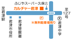 カルチャー君津 〒299-1152 千葉県君津市久保3-10-11-202 ■君津駅南口より 徒歩14分 ■君津駅南口よりコミュニティバス小糸川循環線外回り3分「久保」バス停にて下車 ■君津駅北口より日東交通バス市内循環A5分「久保」バス停にて下車 ※お車でお越しの際は、道を挟んで建物の向い側にございます無料駐車場をご利用ください
