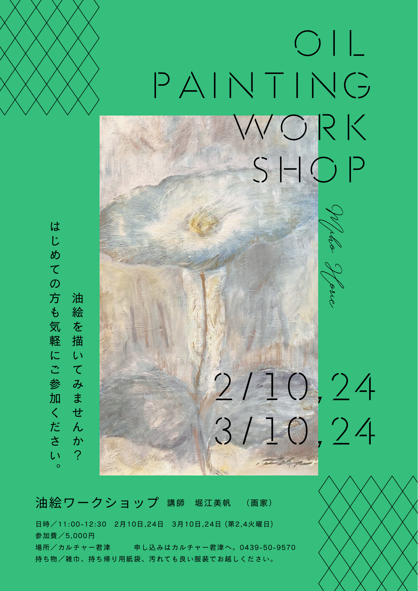 | 講座費用 | [油絵ワークショップ] ●費用 5,000円(1回) --------------------------- [4月からの通常講座] 月額費用合計 9,000円 内訳 ▶ ■受講料 8,800円/月(共用費 500円/月を含む) ■施設維持費 200円/月 |